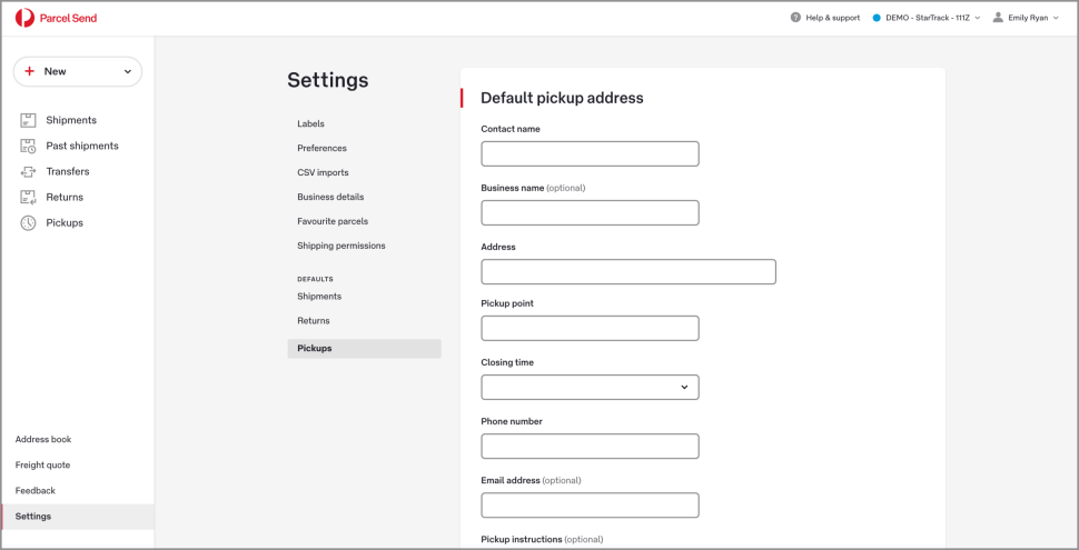 If you regularly create pickups with the same details (for example, the same pickup point or the same closing time), you can set pickup defaults to automatically fill in those details when you create a new pickup. You can always edit these details as you go.