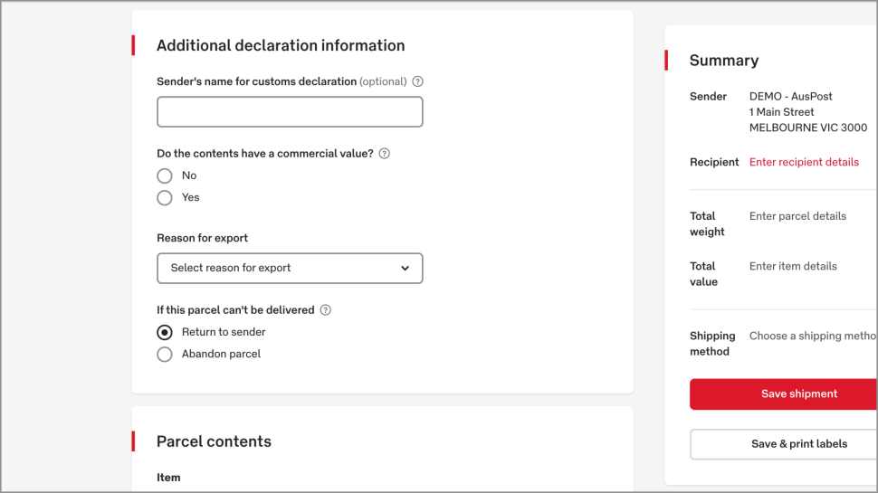 The ‘Parcel’ is the overall package being sent and not the individual items within it. Total weight, parcel dimensions, and the dangerous goods declaration are mandatory. Transit cover value is optional.
